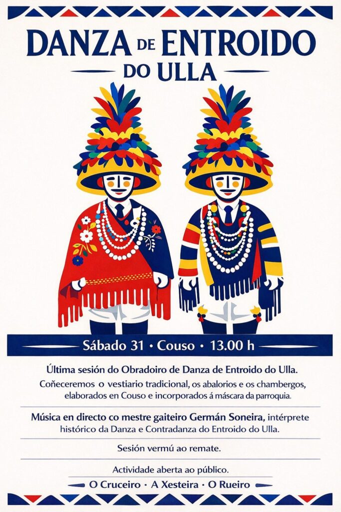 O sábado 31 de xaneiro teremos en Couso a última sesión do Obradoiro da Danza de Entroido do Ulla, na que coñeceremos o vestiario tradicional, os abalorios e os chambergos, elaborados en Couso.